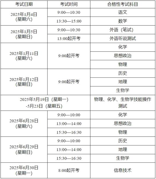 思想政治、歷史、地理、物理、化學、生物學2025 年 1 月的合格性考試采用機考方式,多科混排同時開考;6 月的合格性考試采用閉卷筆試方式,且物理、化學和生物學合格性考試另設(shè)技能操作測試,測試時間均為 15 分鐘。