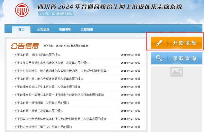 2、進入四川省2024年普通高校招生網上填報征集志愿系統(tǒng),可以看到最新的征集志愿通知,考生可以查看最新的征集志愿填報時間及填報規(guī)則,在規(guī)定的時間內點擊開始填報后進入征集志愿的登錄界面。