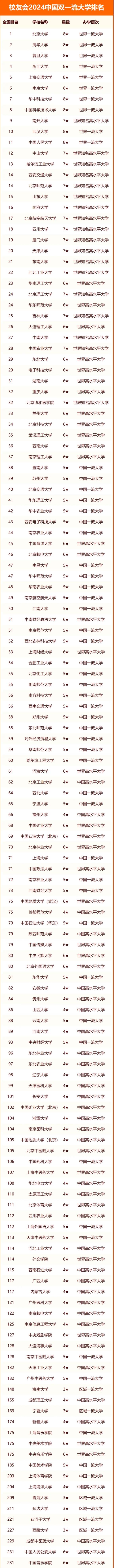 全國雙一流大學全部排名一覽表匯總