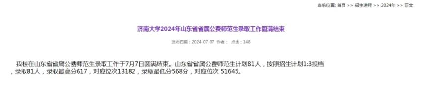 2024年濟(jì)南大學(xué)省屬公費(fèi)師范生共計(jì)劃招收81人,實(shí)際錄取81人,錄取分?jǐn)?shù)線在568-617分之間,錄取位次在13182-51645之間。