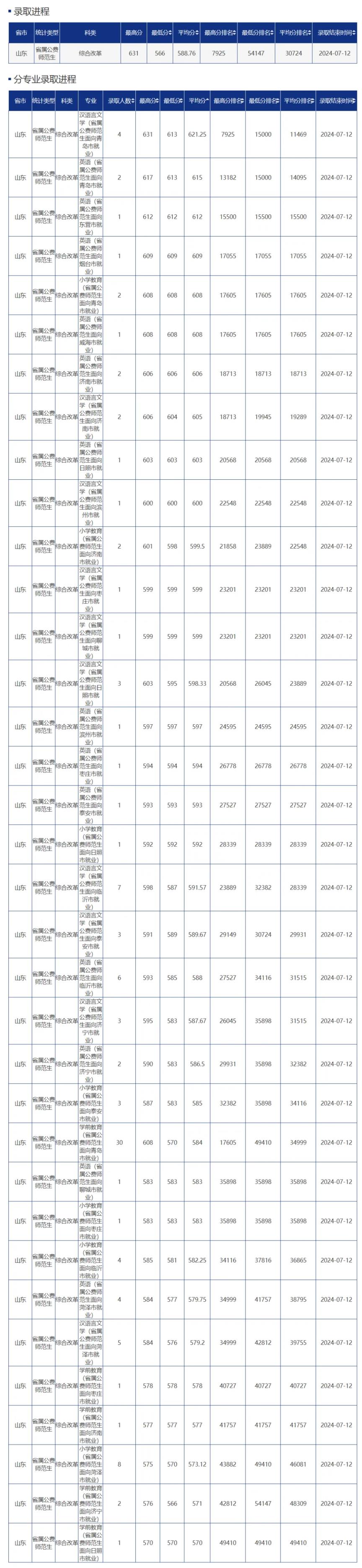 2024年山東省屬公費(fèi)師范生錄取分?jǐn)?shù)線(含最低位次)