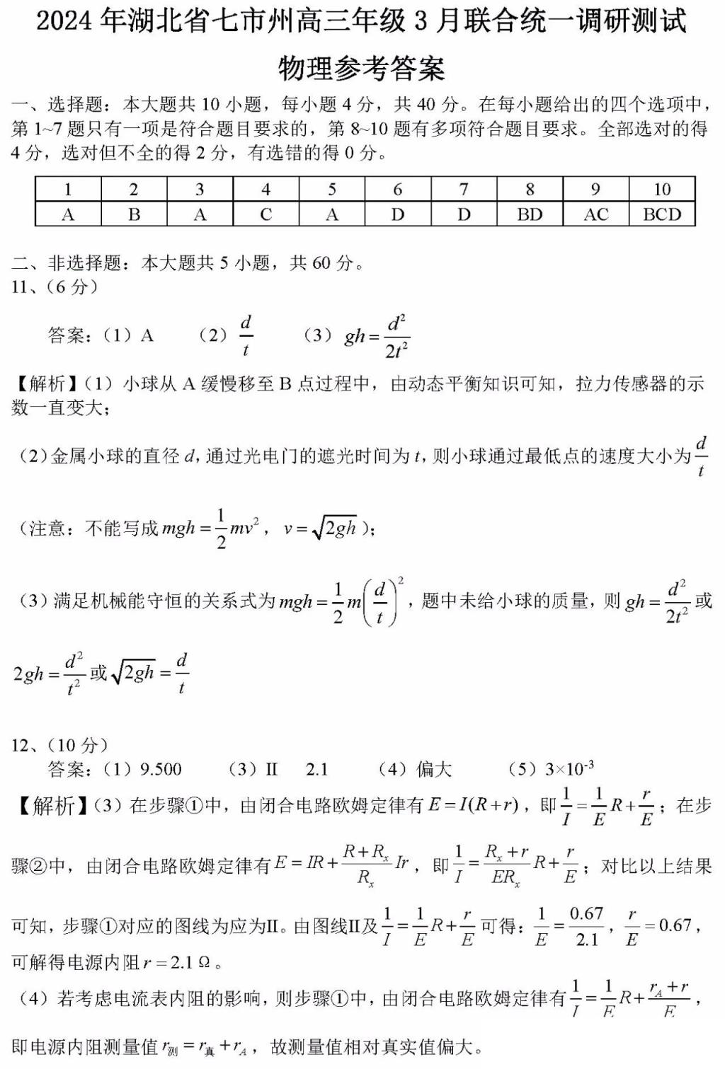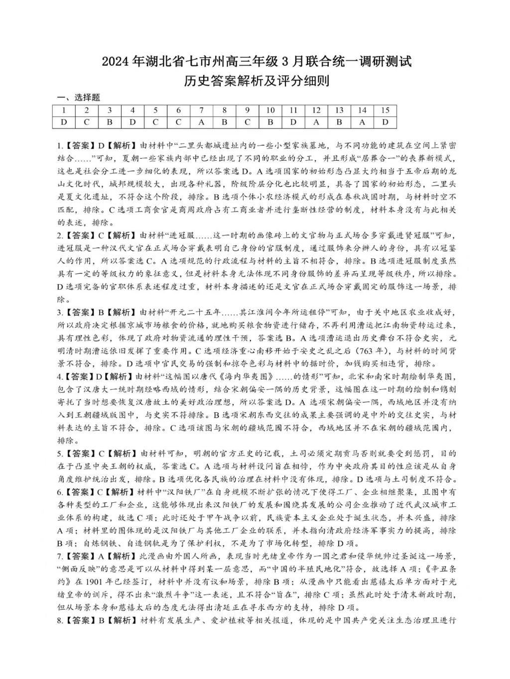 五、湖北省七市州聯(lián)考2024物理/歷史試題及答案解析