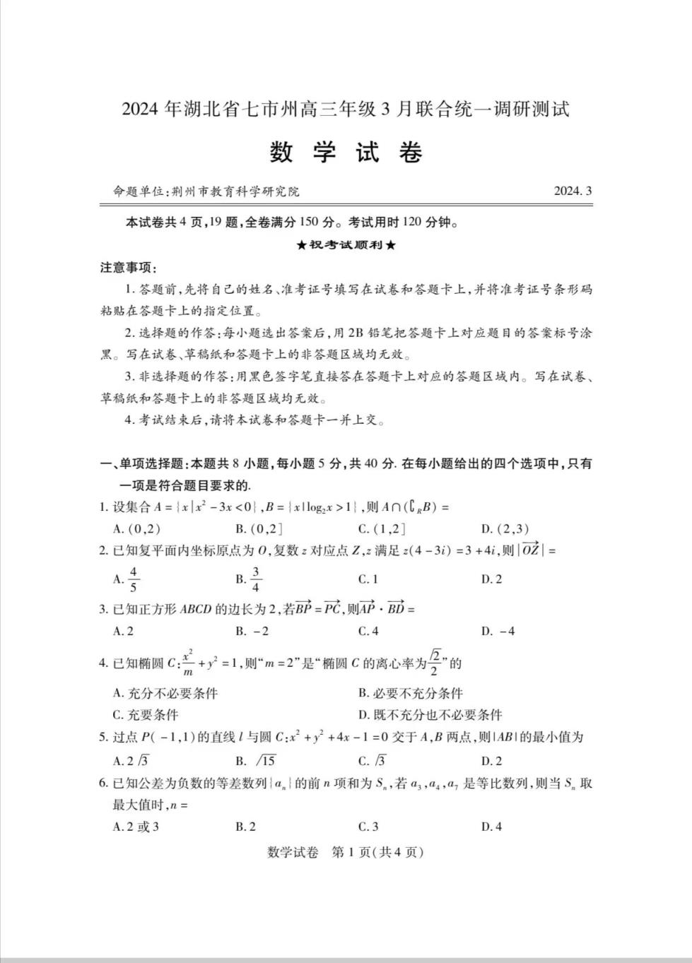 三、湖北省七市州聯(lián)考2024數(shù)學試題及答案解析