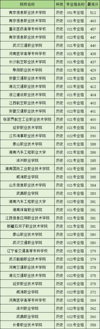分?jǐn)?shù)線比較低的還有延安職業(yè)技術(shù)學(xué)院022專業(yè)組(375分)、威海職業(yè)學(xué)院022專業(yè)組(372分)、河南醫(yī)學(xué)高等??茖W(xué)校023專業(yè)組(369分)、濱州職業(yè)學(xué)院022專業(yè)組(362分)、武昌職業(yè)學(xué)院022專業(yè)組(360分)。