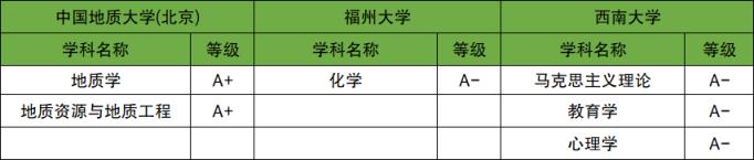 根據(jù)2023年軟科中國(guó)大學(xué)排名,與西南大學(xué)綜合實(shí)力相當(dāng)?shù)姆謩e為中國(guó)地質(zhì)大學(xué)(北京)和福州大學(xué),本文整理了北地、福大、西南大在全國(guó)第四輪學(xué)科評(píng)估中A類等級(jí)的學(xué)科,中國(guó)地質(zhì)大學(xué)(北京)獲評(píng)A+的學(xué)科最多。