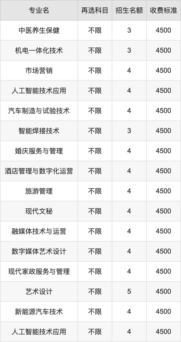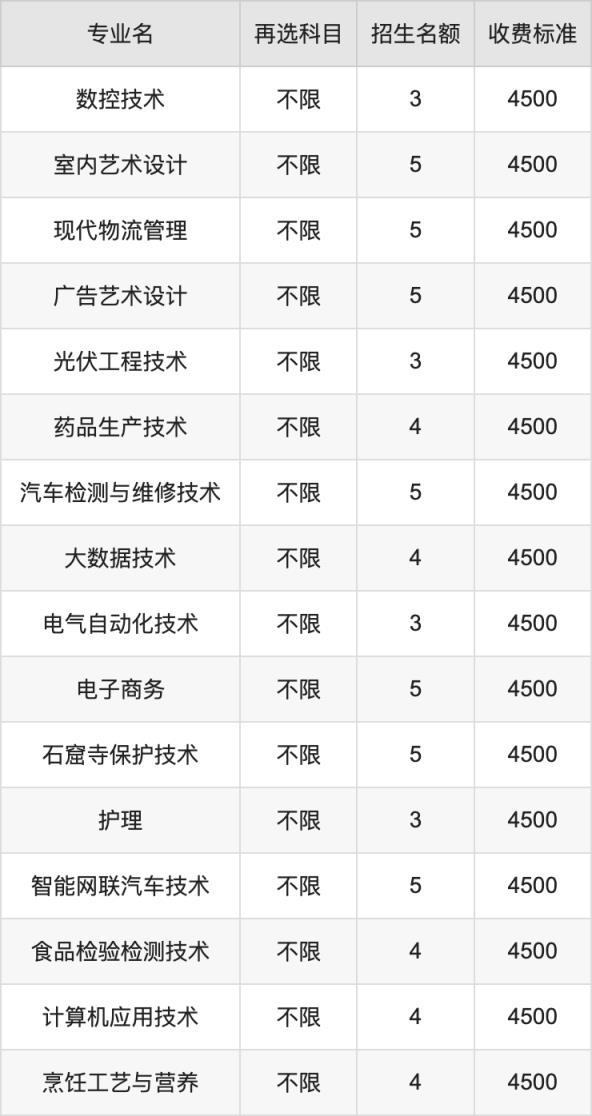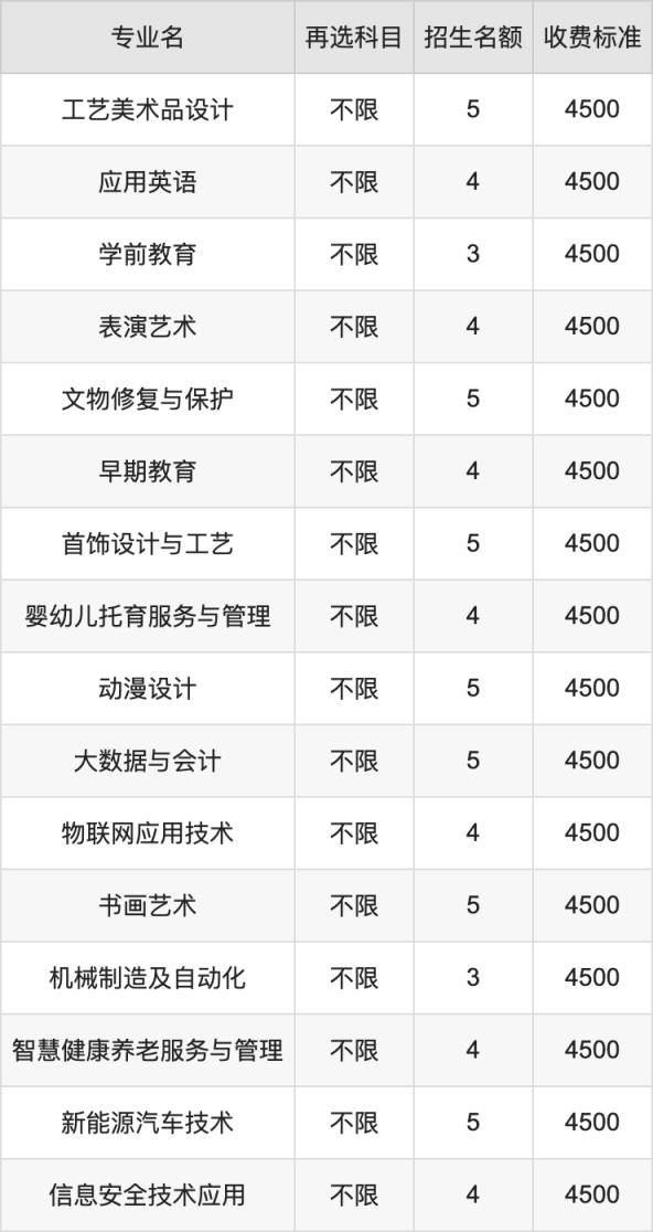 蘭州職業(yè)技術(shù)學(xué)院在歷史組高職??婆鶵段招生的各個專業(yè),每年的學(xué)費是4500元。招生人數(shù)最多的專業(yè)是工藝美術(shù)品設(shè)計,2024年招5人,學(xué)費是4500元。