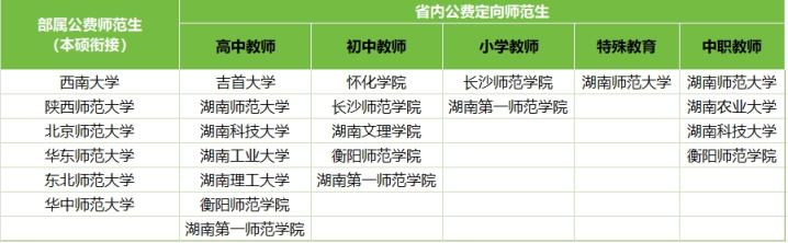 在湖南省公費師范生計劃主要分為國家公費師范生計劃和省內(nèi)定向公費師范生計劃,國家公費師范生計劃主要由部屬公費師范生院校進行承擔,省內(nèi)定向師范生計劃主要分為小學教師、初中教師、高中教師、特殊教育教師、中職教師培養(yǎng)計劃,承擔培養(yǎng)計劃的院校名單如下: