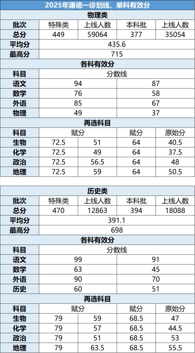 2025重慶康德一診:分?jǐn)?shù)劃線、一分一段表、各科平均分匯總