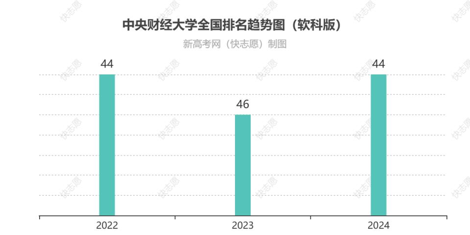 從歷年排名變化趨勢圖可見:中央財(cái)經(jīng)大學(xué)在全國排名2024為第44位、2023為第46位、2022為第44位,最近兩年排名呈上升趨勢,綜合實(shí)力有所提高。