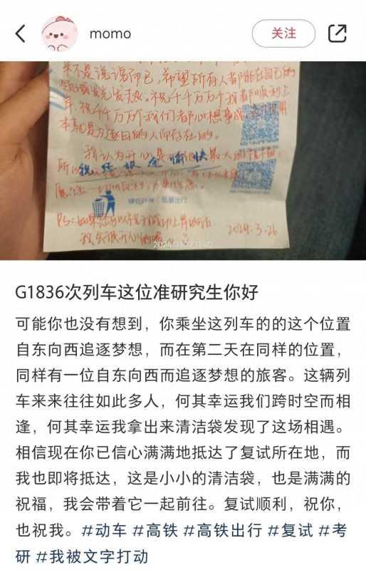 3月27日,小紅書網(wǎng)友“momo”發(fā)布了一條名為“G1836次列車的這位準研究生你好”的帖子,帖中附上了一張寫滿紅色字跡的清潔袋。