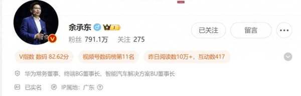 余承東社媒認證信息更新!變更為董事長,具體情況如何?