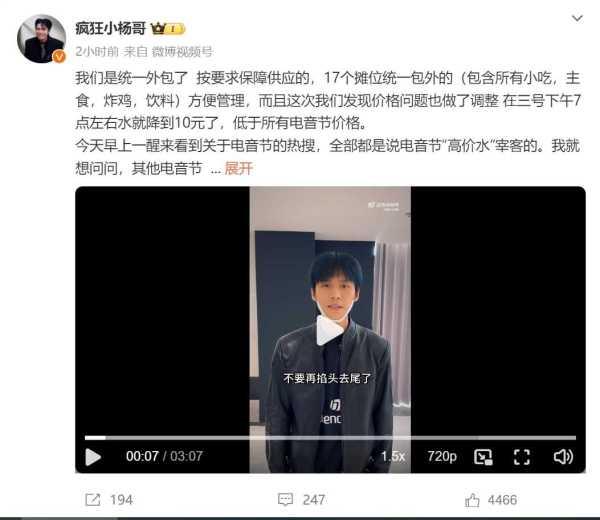5月7日下午,瘋狂小楊哥在微博對(duì)此回應(yīng)稱(chēng):“我們是統(tǒng)一外包了 按要求保障供應(yīng)的,17個(gè)攤位統(tǒng)一包外的(包含所有小吃,主食,炸雞,飲料)方便管理,而且這次我們發(fā)現(xiàn)價(jià)格問(wèn)題也做了調(diào)整,在三號(hào)下午7點(diǎn)左右水就降到10元了,低于所有電音節(jié)價(jià)格。
