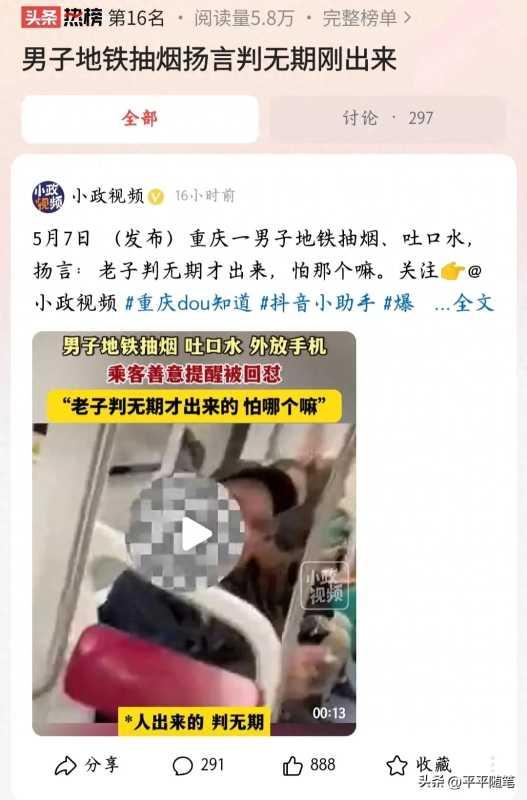 近日,重慶,一男子地鐵抽煙吐口水,揚言老子判無期才出來,誰都不怕一事引發(fā)全網(wǎng)關(guān)注。