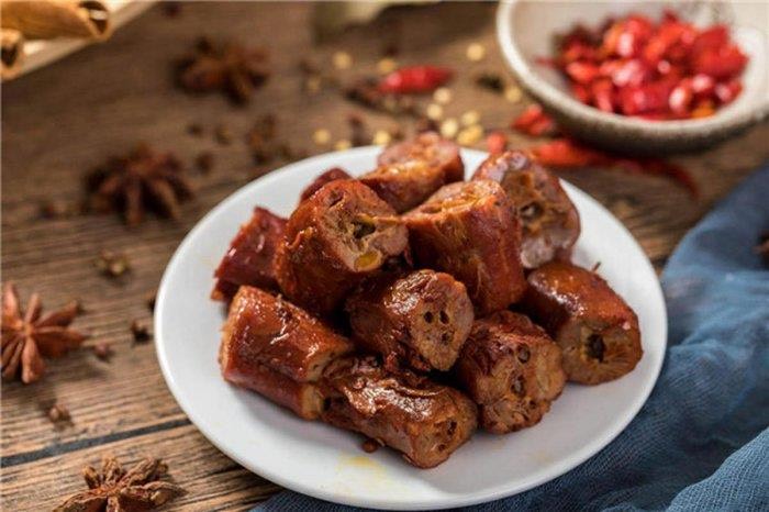 武漢鴨脖是武漢的特色小吃,聞名全國。鴨脖經(jīng)過精心挑選,采用多種香料浸泡,然后經(jīng)過風(fēng)干、烤制等工序精制而成。成品色澤深紅,具有香、辣、甘、麻、咸、酥、綿等特點,口感緊實有嚼勁,越啃越香,是一道非常受歡迎的佐酒小吃,比較有名的品牌有精武鴨脖、周黑鴨鴨脖等。