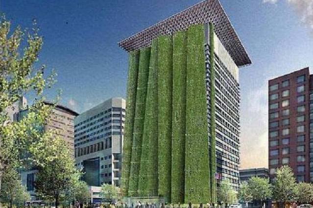 從二十世紀(jì)后期還是,環(huán)保這一話題就成為了世界的主旋律,全世界開始提倡環(huán)保熱愛綠色,很顯然這座市政大廈就是一個很合格的環(huán)保主義者。幾條綠色草坪從大廈頂端直接覆蓋到了地面,讓整個大廈的正面完全成為了一片草地,這種矯枉過正的惡趣味,實在不知道設(shè)計者的思路是什么,他想把這里假裝成一棵樹嗎?