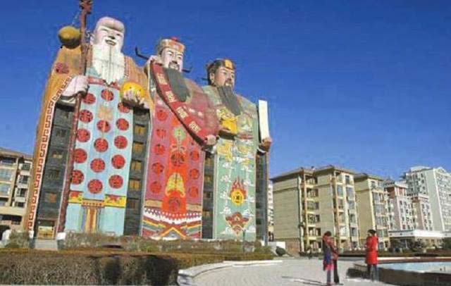 該酒店的外形為傳統(tǒng)的“福祿壽”三星彩塑,讓人產(chǎn)生一種酒店在它們肚子中的奇怪感覺。同時傳統(tǒng)“福祿壽”三星給人的感覺應(yīng)該是圓潤和藹,而這個天子大酒店的福祿壽則是方頭方腦的,要不是從衣著造型上,真的很難看出這原來是“福祿壽”,雖然傳統(tǒng)文化值得推崇,但是天子大酒店的這種設(shè)計只是粗狂的借鑒其外形,絲毫沒有一點文化韻味,實在是讓人難以直視。