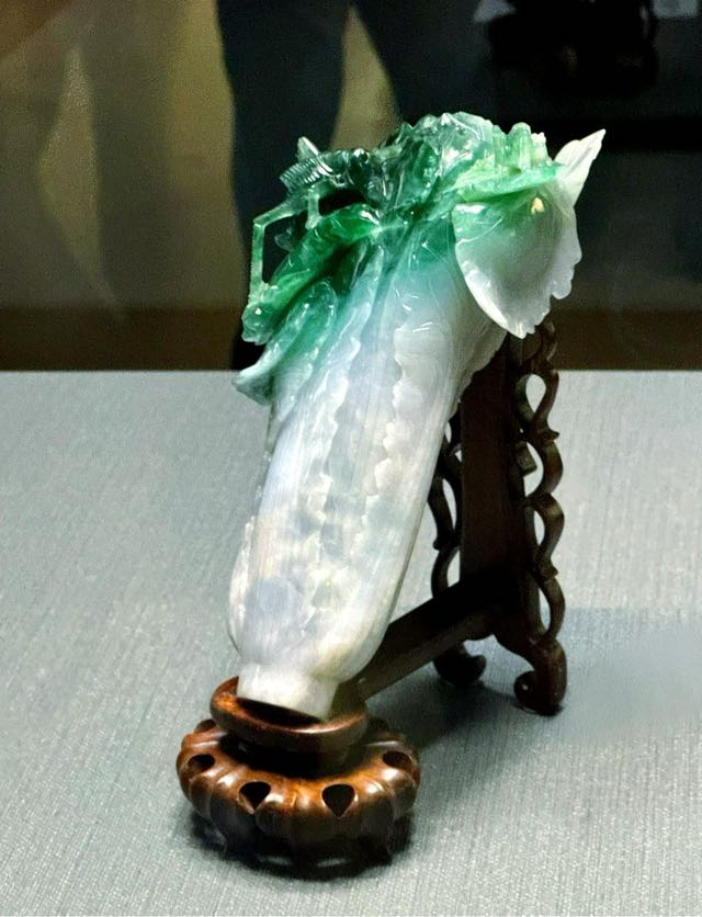 翠玉白菜是清代中后期的翡翠雕刻品,長(zhǎng) 18.7 厘米、寬 9.1 厘米、厚 (高) 5.07 厘米,由一塊半灰白、半翠綠的翡翠玉石雕琢而成。匠人巧妙地運(yùn)用玉石天然的顏色變化,將灰白色部分雕刻成菜幫,綠色部分雕刻成菜葉,而綠色玉料的瑕疵部分則雕刻成趴在菜葉上的螽斯和蝗蟲兩只小昆蟲。#愛丁堡旅游攻略#翠玉白菜整體造型包心、無(wú)根、莖葉脆嫩、葉青莖白,生動(dòng)而又逼真。