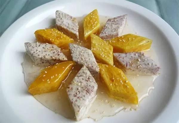 “糕燒”是潮州制作甜食最傳統(tǒng)的一種烹調方法。“頭甜尾甜”是潮州筵席的一大特色,即第一道菜和最后一道菜都是甜食,意喻從頭甜到尾的意思。#凡爾賽意思#所以經常會在潮菜筵席的“頭”或“尾”吃到“金磚銀磚”,其實也就是“糕燒”番薯芋頭,意喻財源滾滾的意思。做的時候先將番薯芋頭(也可以是白果等)初步炸熟或水煮,然后再倒入糖漿中用文火煮。#徐冬冬尹子維官宣訂婚#